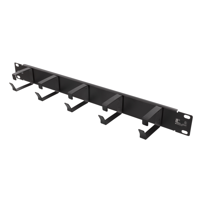 Metal cable management for horizontal cable mounting. The loops are open with a slope to easily insert and remove cables.