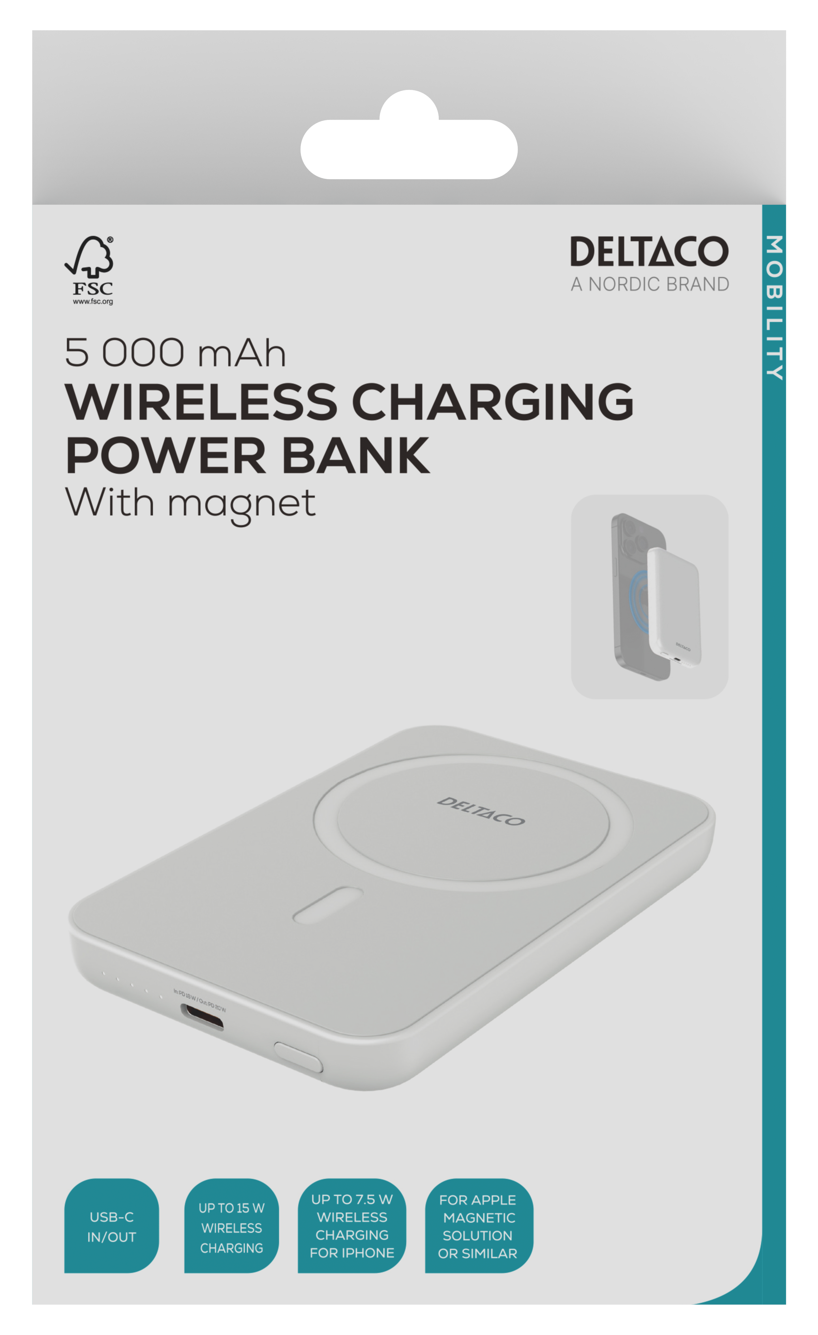 This wireless power bank with a magnet gives a convenient solution to keep your devices charged on the go. 5 000 mAh capacity, it supports up to 15 W wireless charging for compatible devices and 7.5 W for iPhones. It also comes with a PD 20 W USB-C port. Equipped with a built-in magnet compatible with Apple’s magnetic solution and others, an LED battery level indicator, and multiple safety features. Recharge the power bank via USB-C in about 3.5 hours with the included USB-C to USB-C cable.