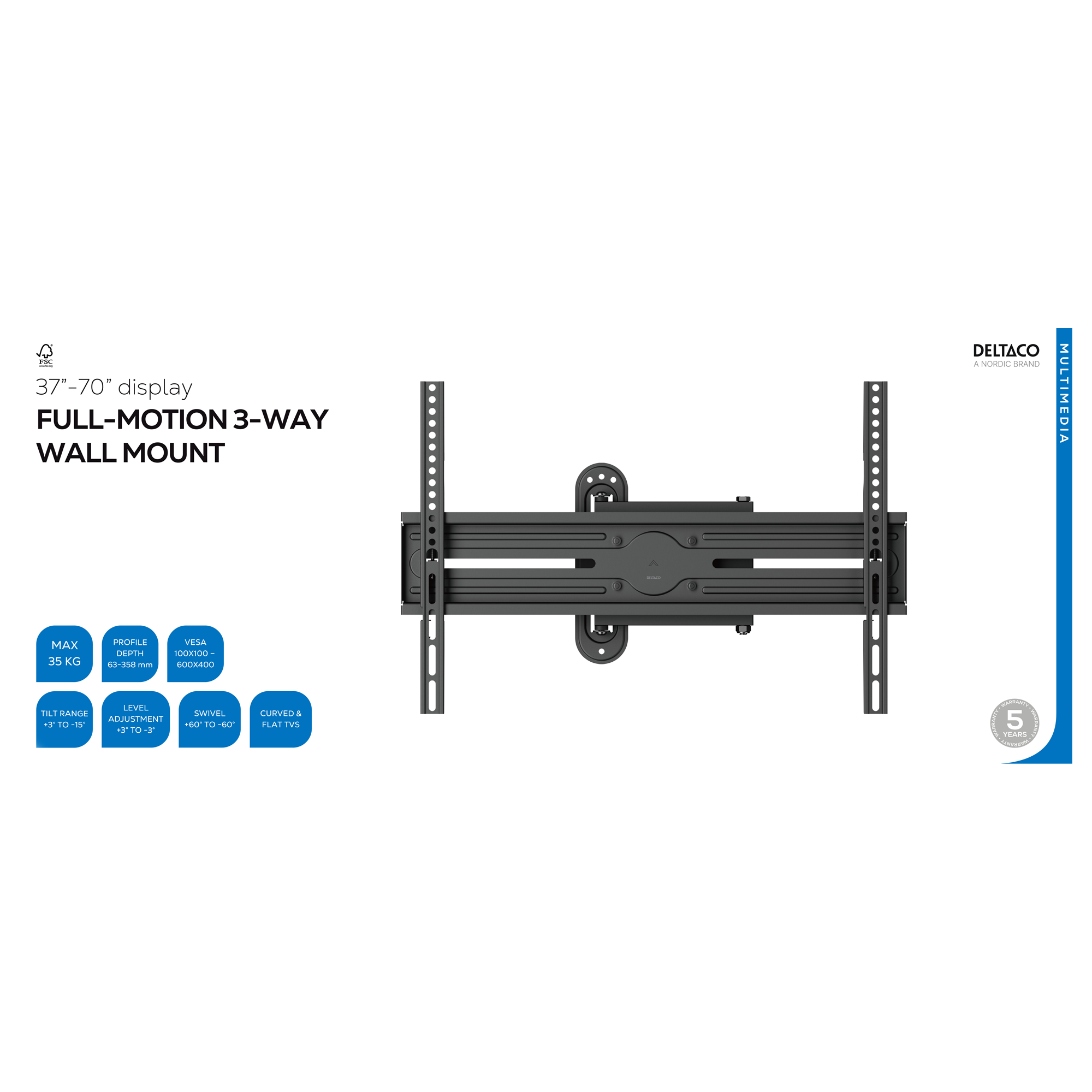 Wall mount, Full motion 3-way, tilt, swivel, 37-70", 35 kg, black