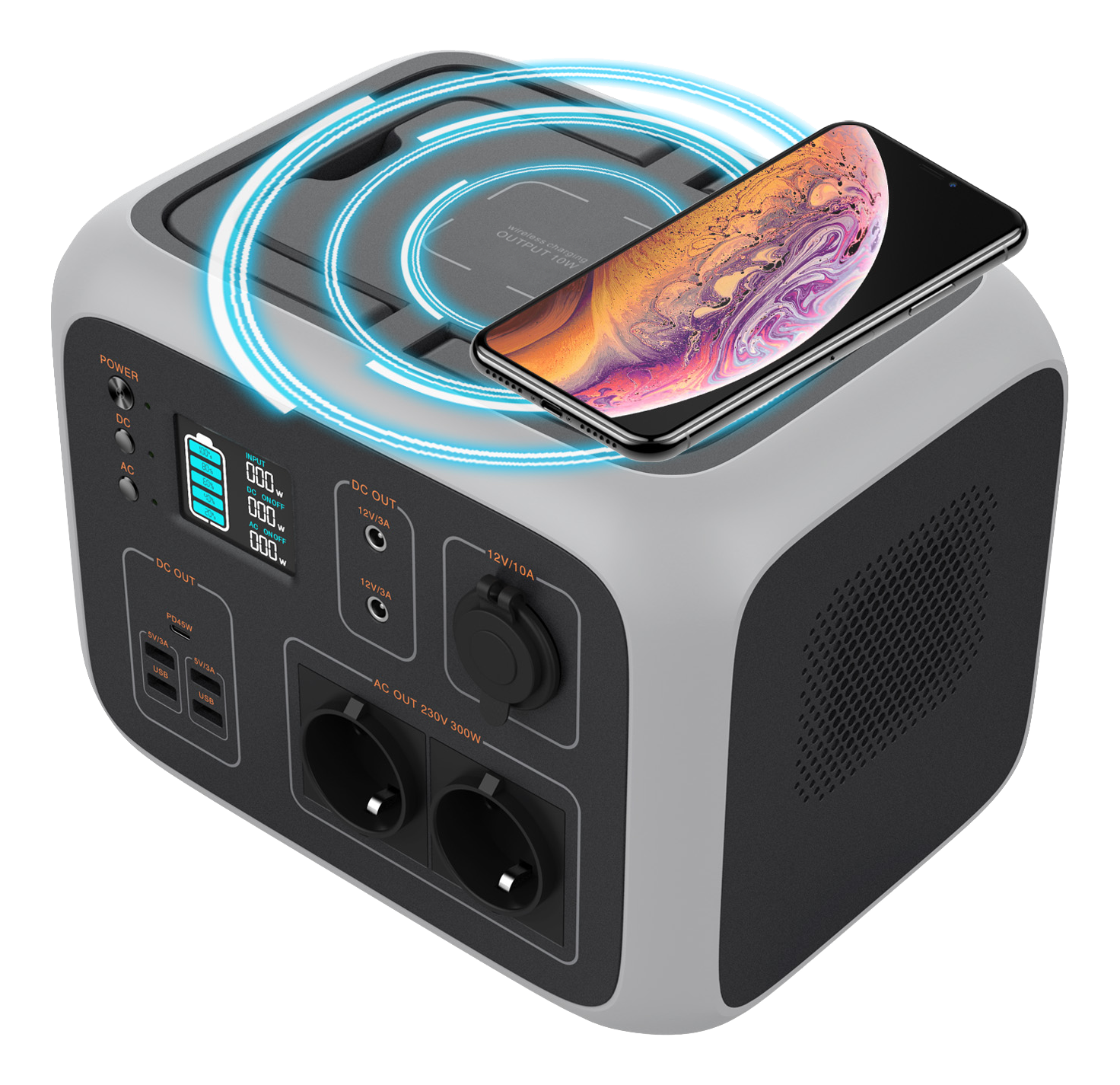 Bærbar strømstasjon, innendørs/utendørs bruk, 500 Wh, grå/svart