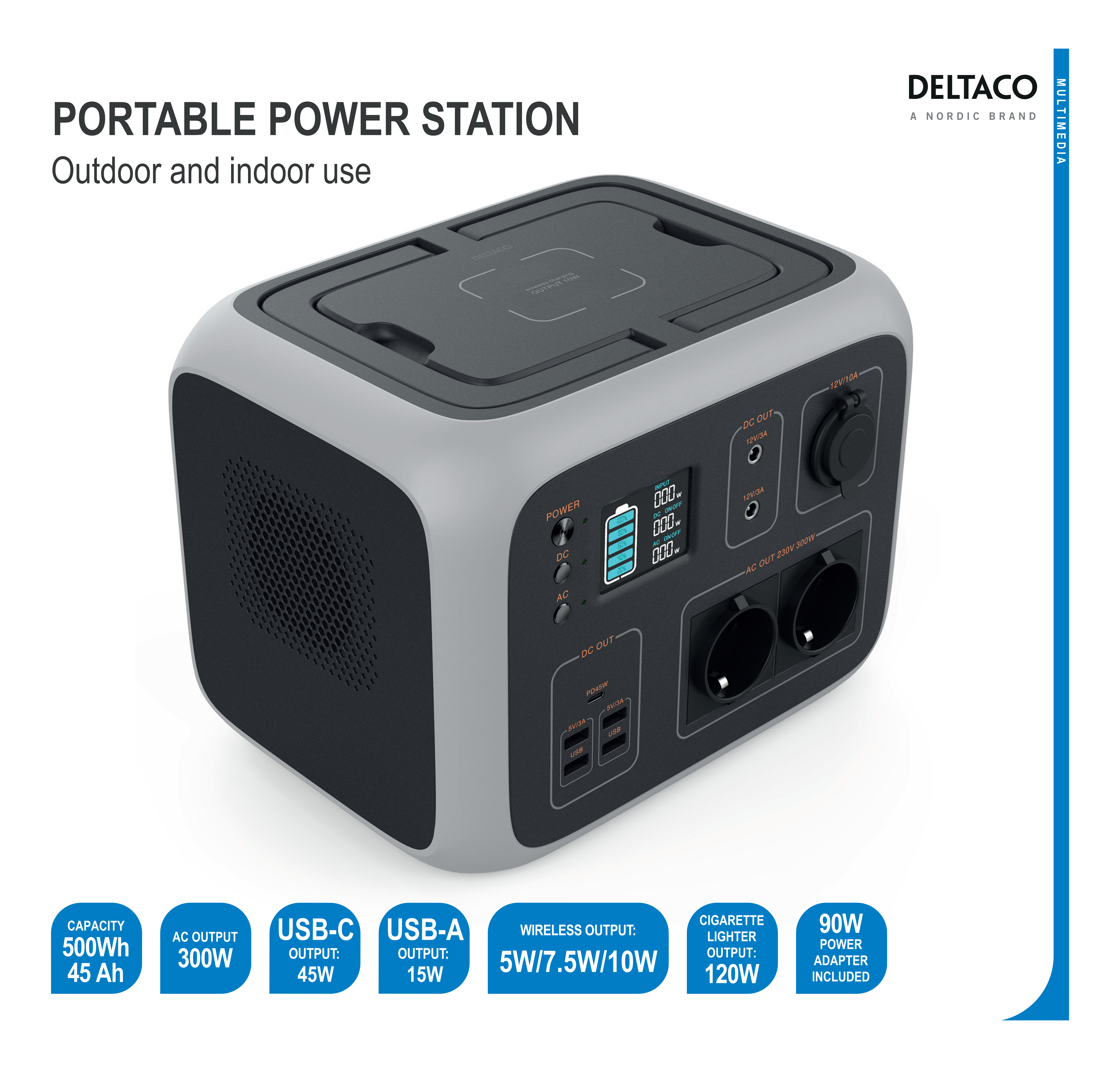 - Tilkoblinger: 4x USB-A hunn; 1x USB-C hunn; 2x AC-uttak (CEE7/3 Schuko-stikkontakter); 2x DC ut (5521); 1x sigarettenner ut; 1x trådløs ladepute; 1x DC-inngang