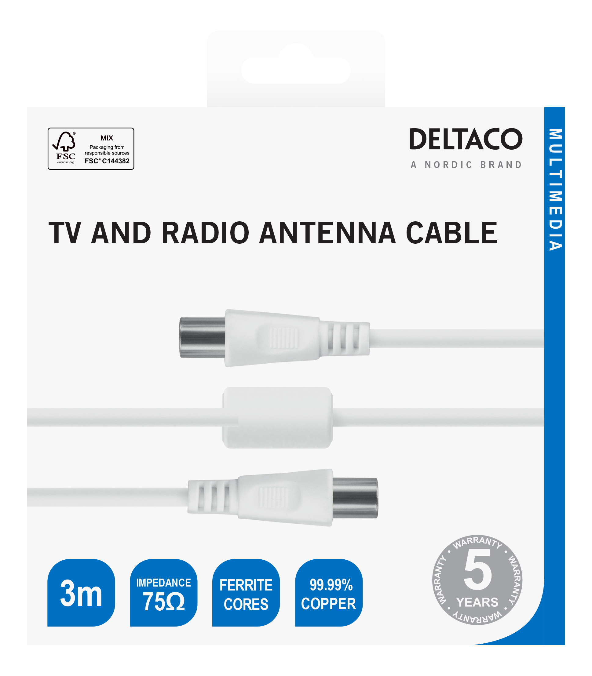 Denne antennekabelen har 75 Ohm impedans og nikkelbelagte kontakter for en pålitelig TV- og radiosignaler. Den har ferrittkjerner som reduserer interferens og er konstruert med svært rent kobber, slik at du får enda bedre signalkvalitet.