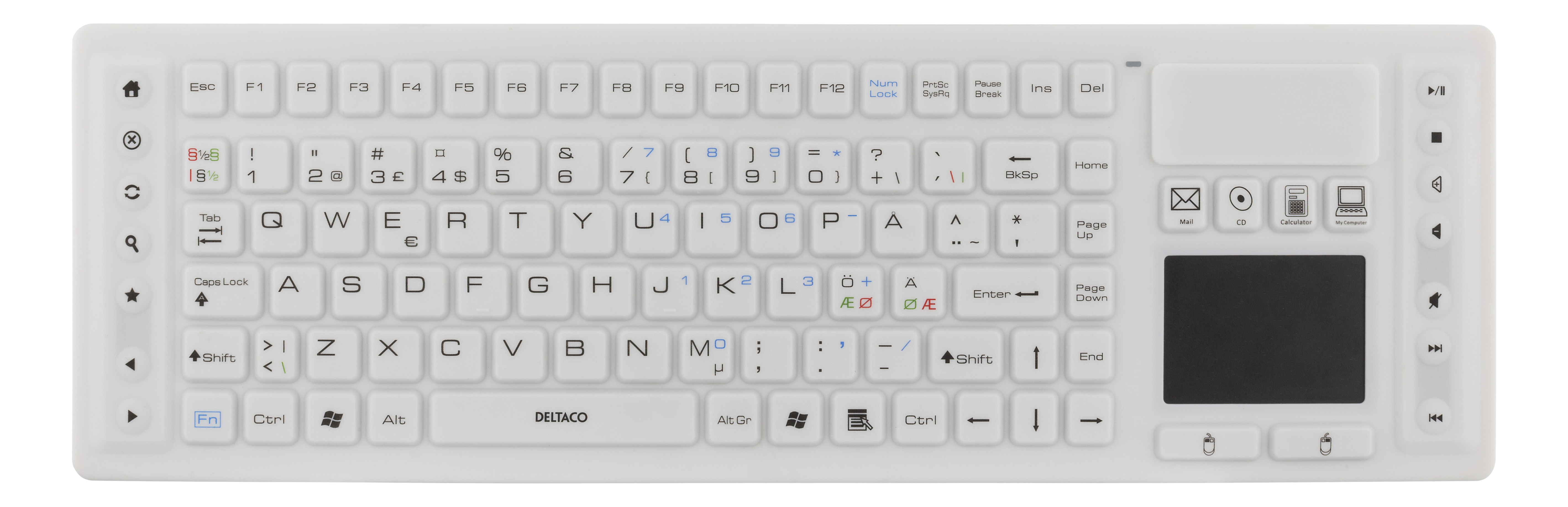 Wireless Keyboard with touchpad, silicone, IP65, 2,4 GHz, 107 keys + 18 functional keys, white. DELTACOS wireless keyboard with touchpad is perfect for work. Because its IP65, its dustproof and spillproof.